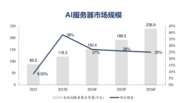在AI算力需求的推动下,AI服务器市场成为增长最快的领域之一。可以看到,在2024年出货量已经突破150万台,实现约27%的显著增长,预计在2025年还将提升至近190万台。