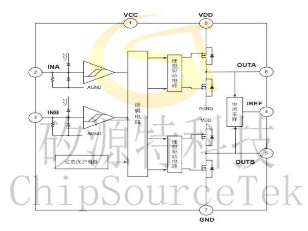 CST861 drive circuit built-in overheat protection circuit. When the load current through the drive circuit is much greater than the maximum continuous current of the circuit, limited by the package heat dissipation capacity, the junction temperature of the chip inside the circuit will rise rapidly, once the set value is exceeded (typical value 150 oC), the internal circuit will immediately turn off the output power tube, cut off the load current, to avoid the continuous rise in temperature caused by plastic packaging smoke, fire and other safety hazards. The built-in temperature hysteresis circuit ensures that the circuit is restored to the safe temperature before allowing the circuit to be controlled again.