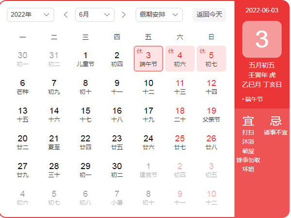 The Dragon Boat Festival holiday in 2022 is arranged from June 3, 2022 to June 5, 2022.