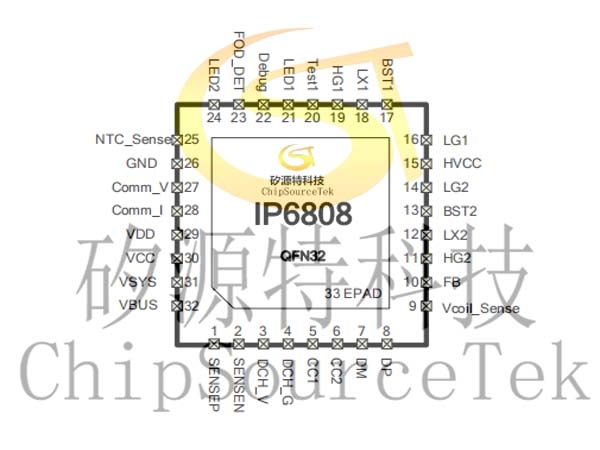 IP6808是一款无线充电发射端控制SoC芯片,兼容WPC Qi v1.2.4最新标准,支持A11线圈,支持5W、苹果7.5W、三星10W、EPP 15W充电。