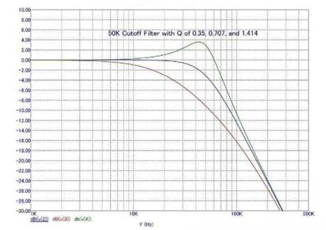 When the Q value is ≥ 0.707, the output filter will have a peak value. The typical frequency response of the output filter under different Q values is shown in the figure below.
